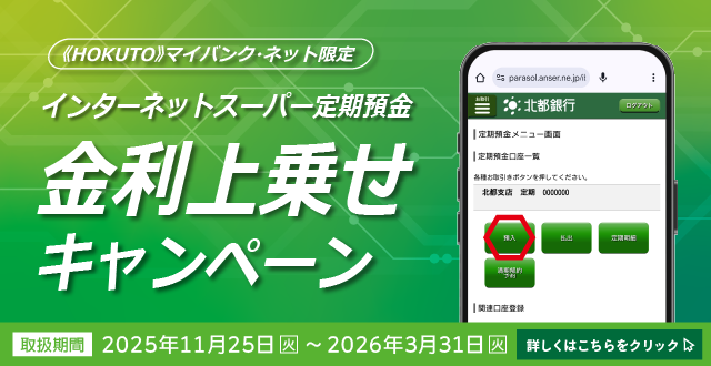 - 2025年12月05日「《HOKUTO》マイバンク・ネット」・「ほくと法人IBサービス」・「北都銀行アプリ」臨時システムメンテナンスに伴うサービス一時休止のお知らせ