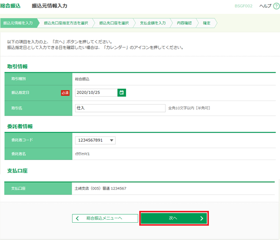 振込指定日をご入力、委託者コードをご選択し、[次へ]をクリックしてください。
