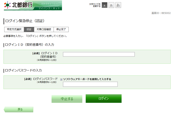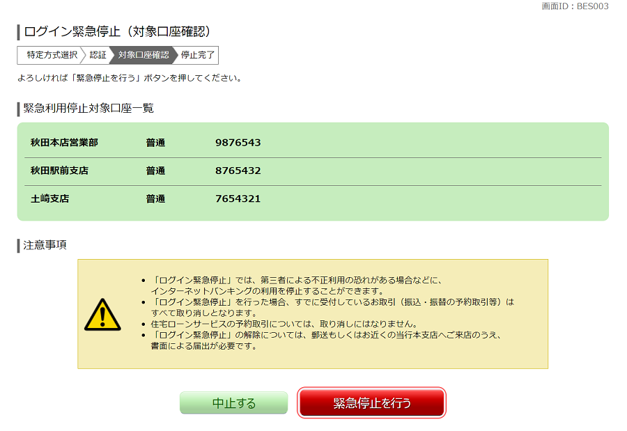 ログイン緊急停止(対象口座確認)画面が表示されます。