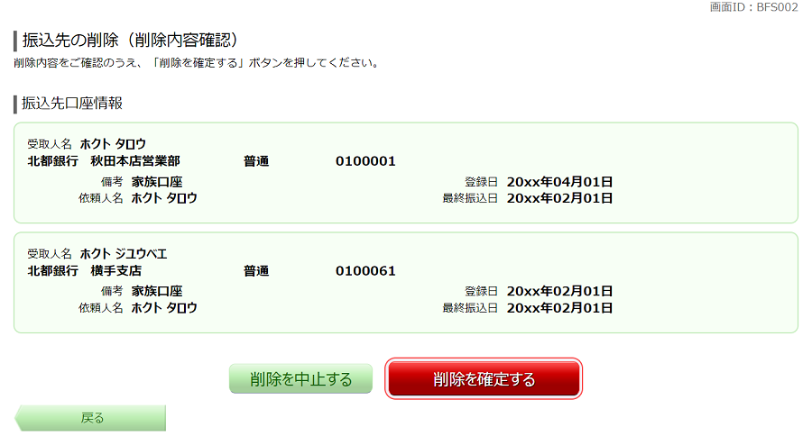 お客さまが登録した振込先口座を削除することができます。