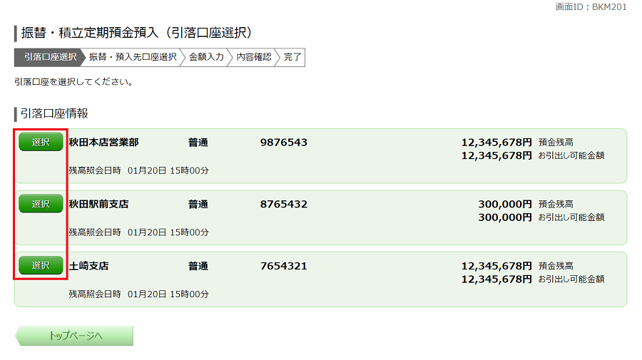振替・積立定期預金預入(引落口座選択)画面が表示されます。