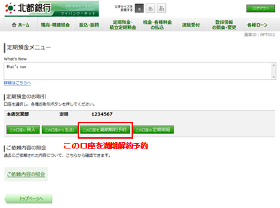 満期日を迎える定期預金の解約予約をおこなうことができます。