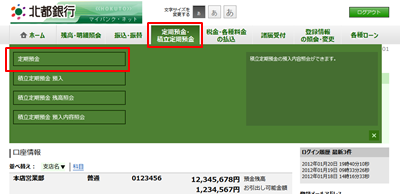トップメニューの[定期預金]をクリックします。
