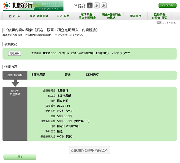 ご依頼内容の照会(振込・振替・積立定期預入 内容照会)が表示されます。