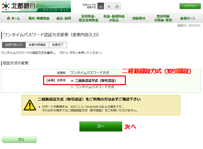 内容を確認し、「二経路認証(取引認証)」を選択のうえ、「次へ」ボタンをクリックします。