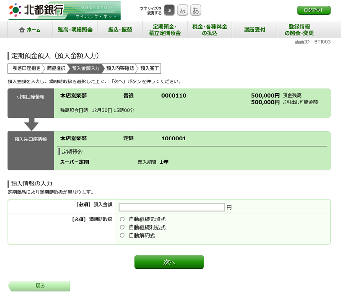 定期預金預入(預入金額入力)画面が表示されます。