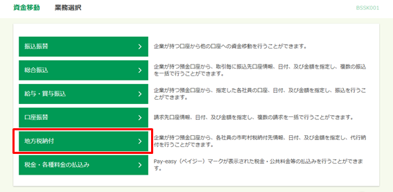 [資金移動]メニューをクリックし、[地方税納付]をクリックします。